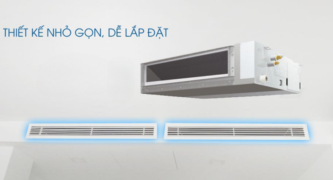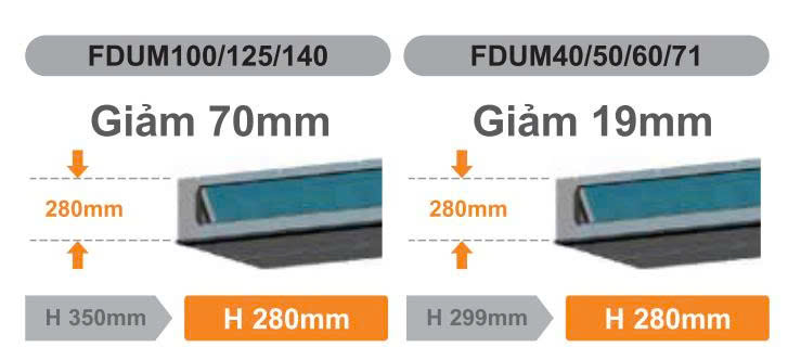 Thiết Kế Mỏng: Chiều cao của dàn lạnh FDUM đã được tối ưu hóa, có thể giảm chiều cao xuống chỉ 280mm (giảm 70mm so với một số model cũ hơn). Điều này giúp việc lắp đặt trở nên dễ dàng hơn, đặc biệt trong các không gian có hạn chế chiều cao trần.